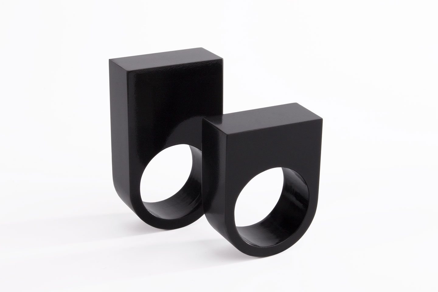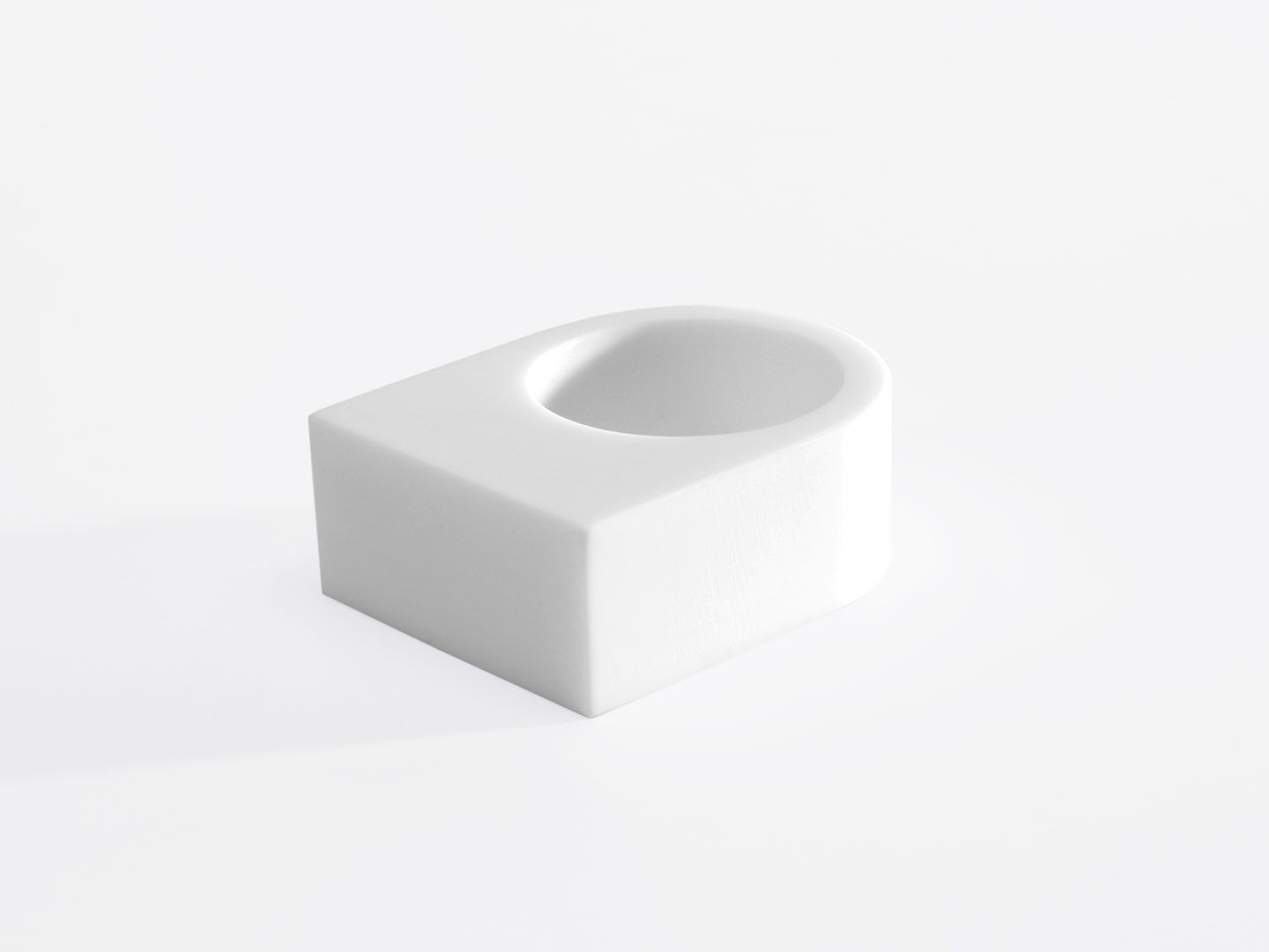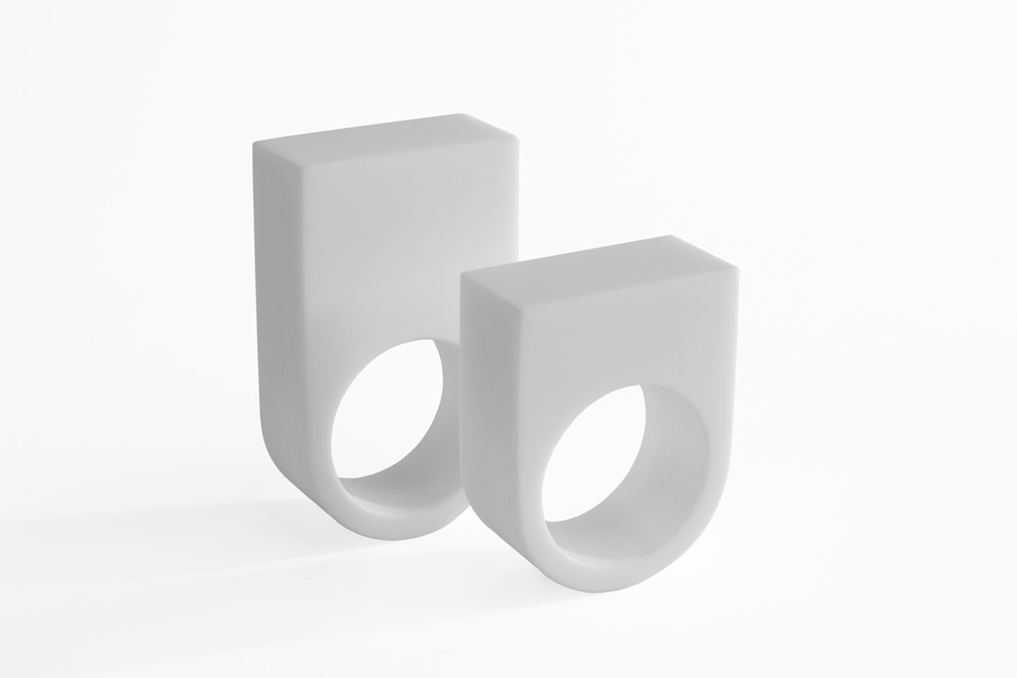 The shape of the Ringcollection is a geometric form with sharp edges and a smooth textured surface. It’s a jewelry sculpture developed from one piece of natural mineral and high performance acrylic : a monolith. First cutting the monolithrings with a CNC machine from a big sheet , then the final step is polishing every single ring by hand.