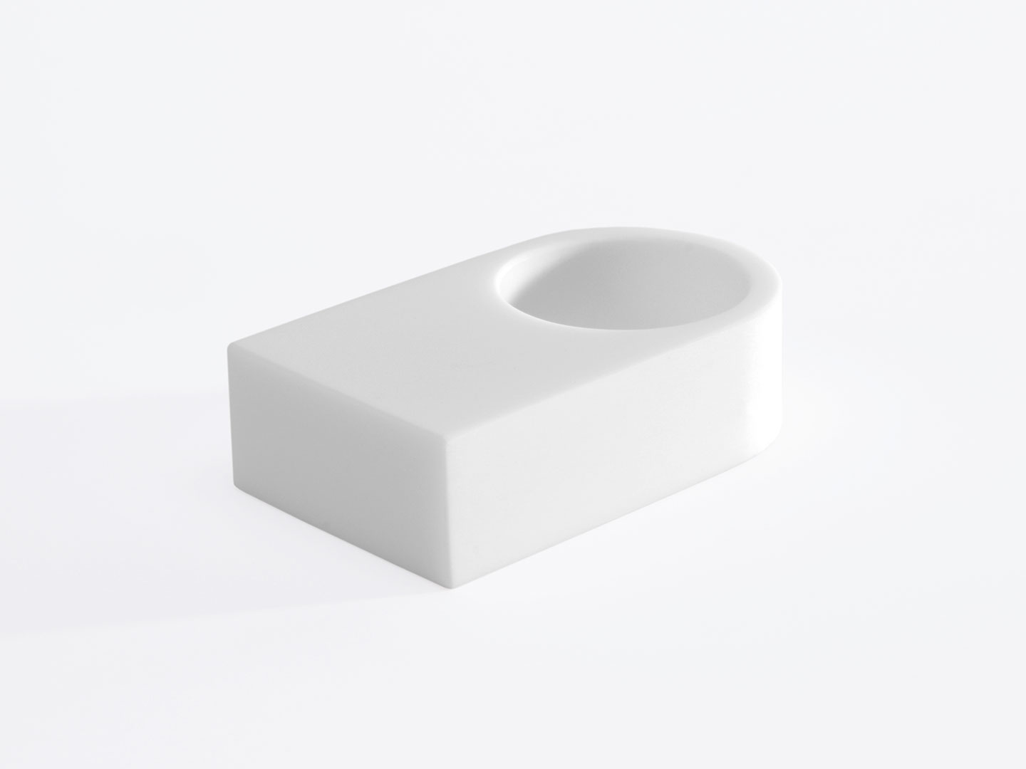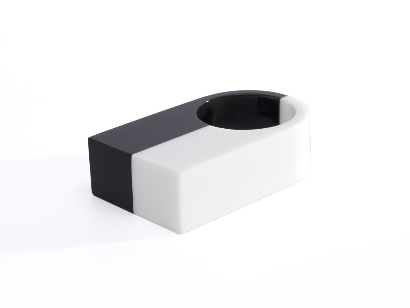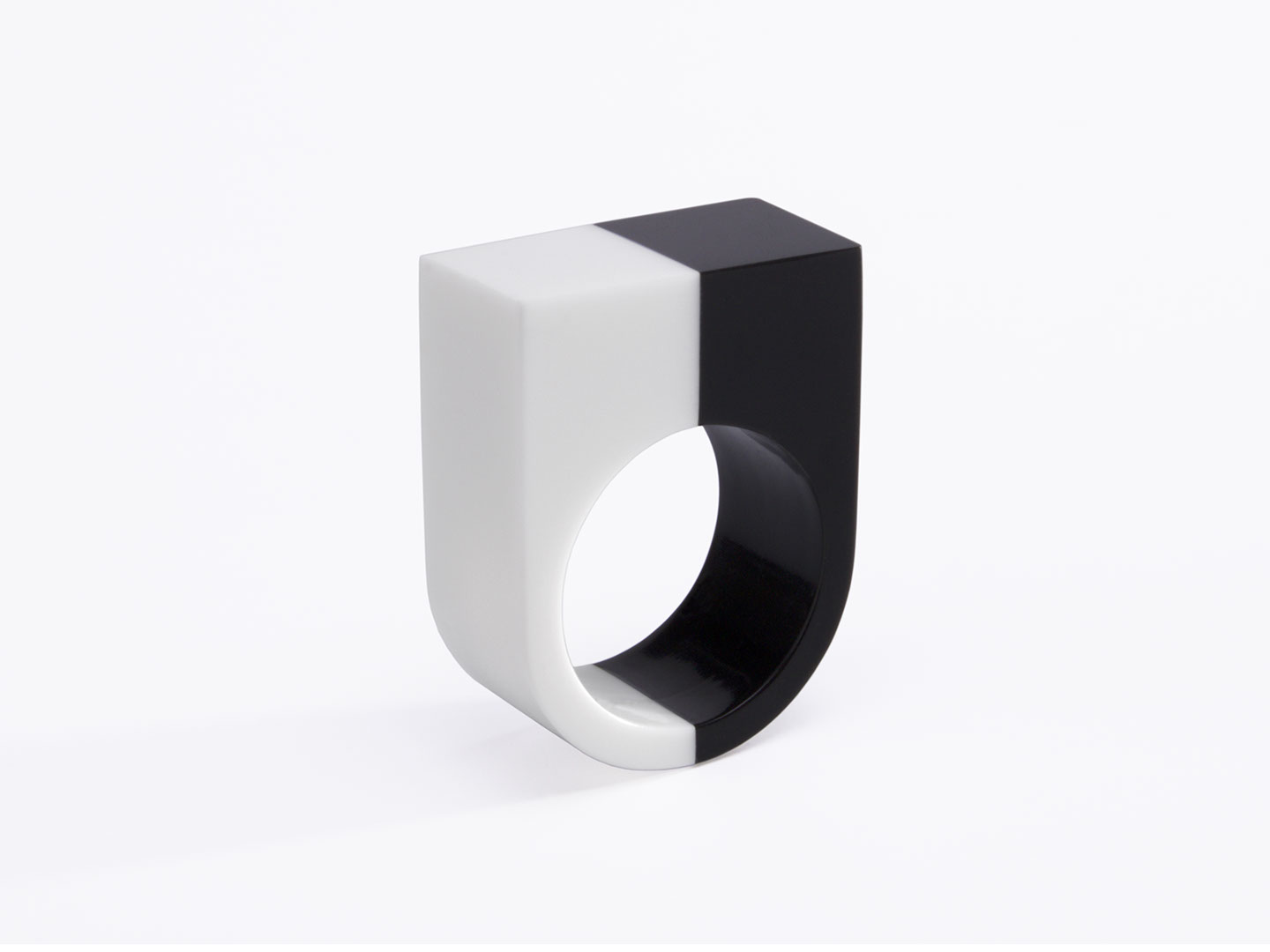 The shape of the Ringcollection is a geometric form with sharp edges and a smooth textured surface. It’s a jewelry sculpture developed from one piece of natural mineral and high performance acrylic : a monolith. First cutting the monolithrings with a CNC machine from a big sheet , then the final step is polishing every single ring by hand.